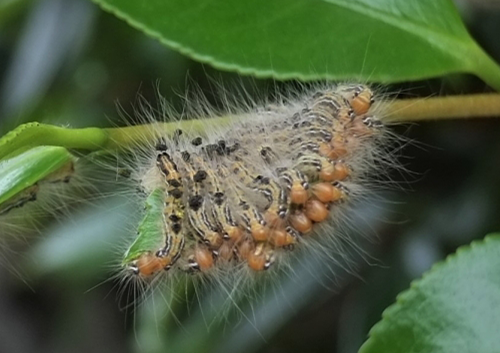 カレハガ科の蛾が。開張は雄約5センチメートル。